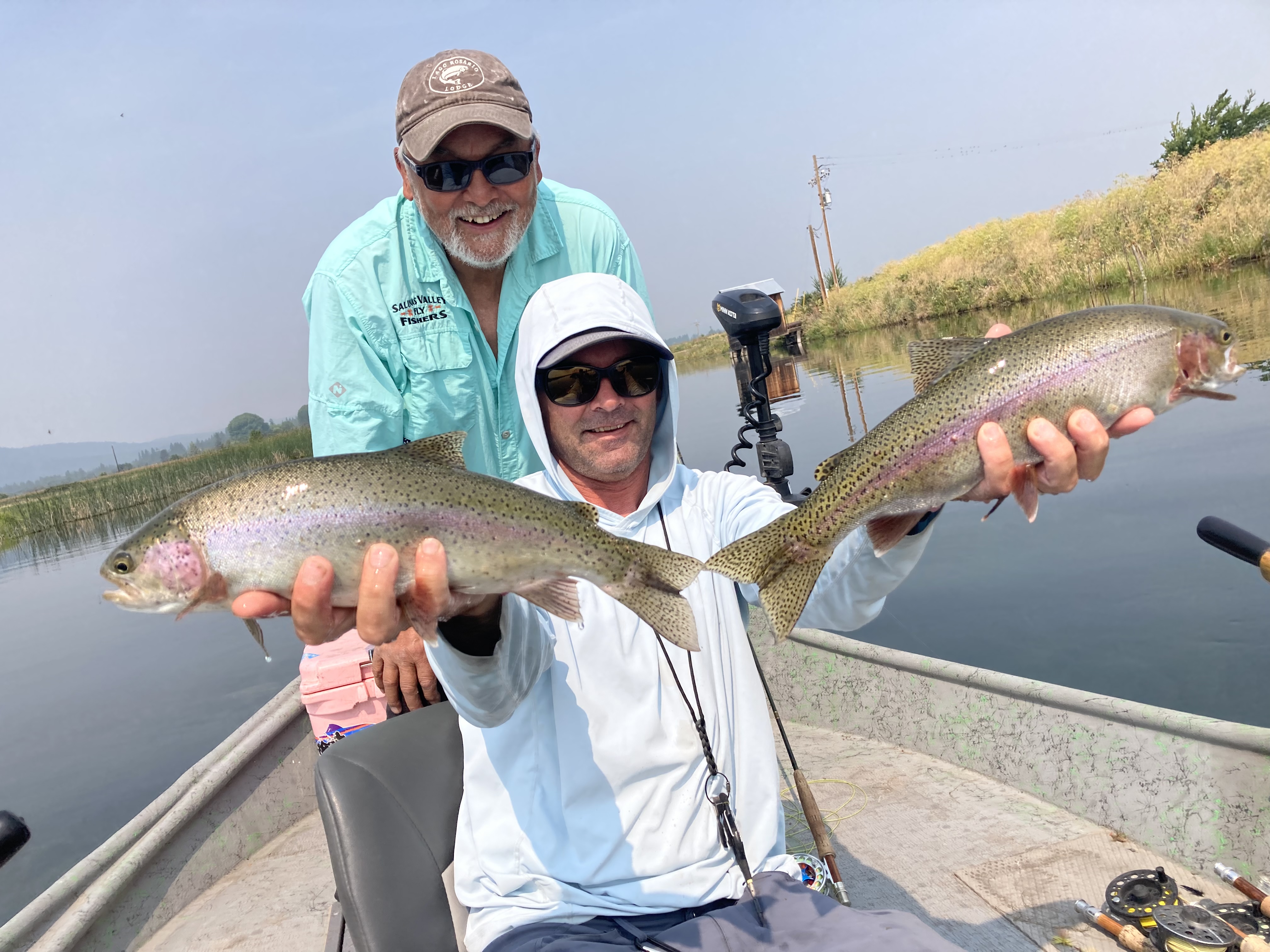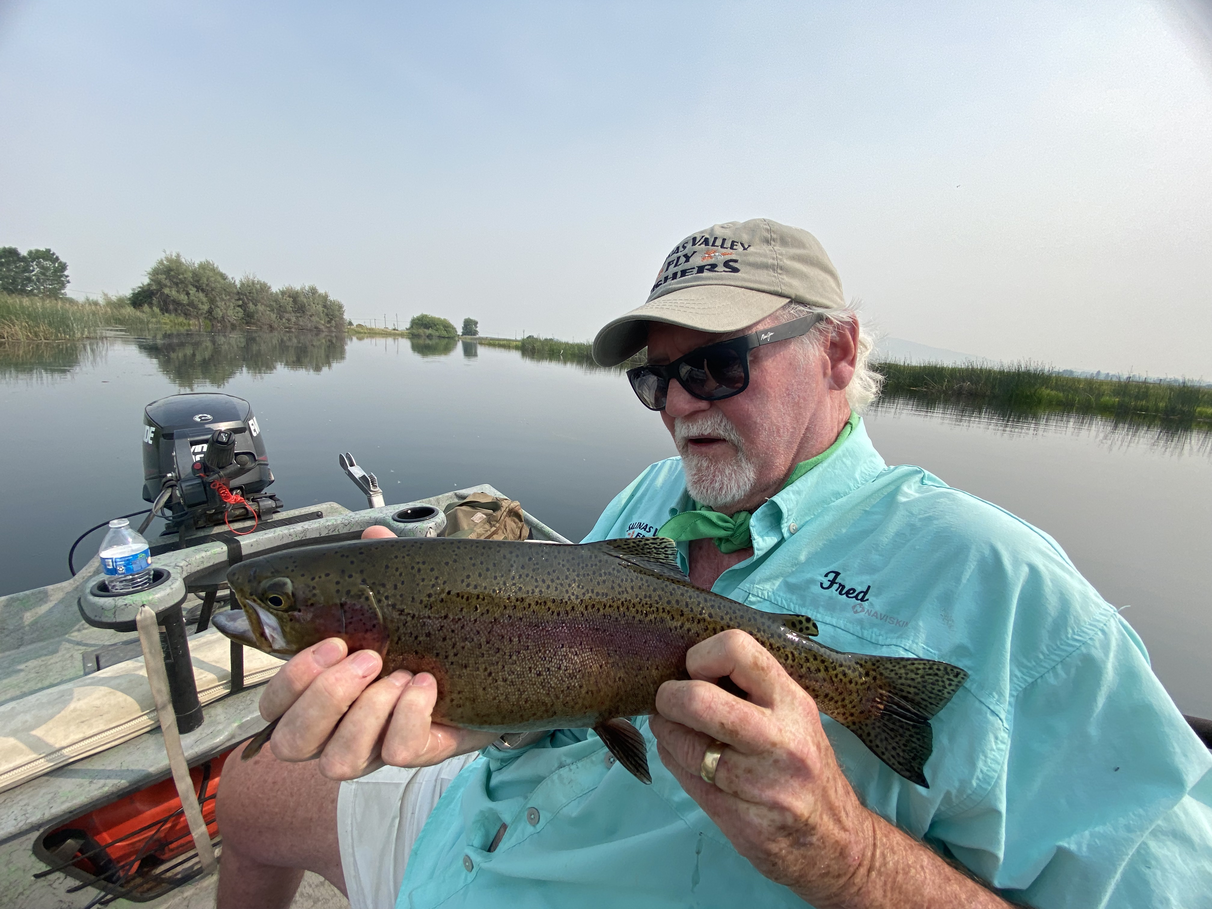 July 23-25, 2021. Thus far it has been a slow year on the water for our members. Fred DeYoung and Wilson Taguinod chanced a 3 day trip to Northern California to test their luck with high mountain Rainbows. Friday afternoon found them on Manzanita lake with no fish landed. Fred had a nice fish break him off and Wilson lost two nice fish in the weeds but it was slow going the whole afternoon. Saturday on Crater lake proved to be the elixir to cure our joneses with 60+ fish landed for the day! They ate anything we presented but were particularly fond of a size 8 stimulator. Sunday was the icing on the cake, however. We were guided on the Fall River by Jay Cockrum and landed 30+ quality rainbows from 12-20″. Here are some photos: